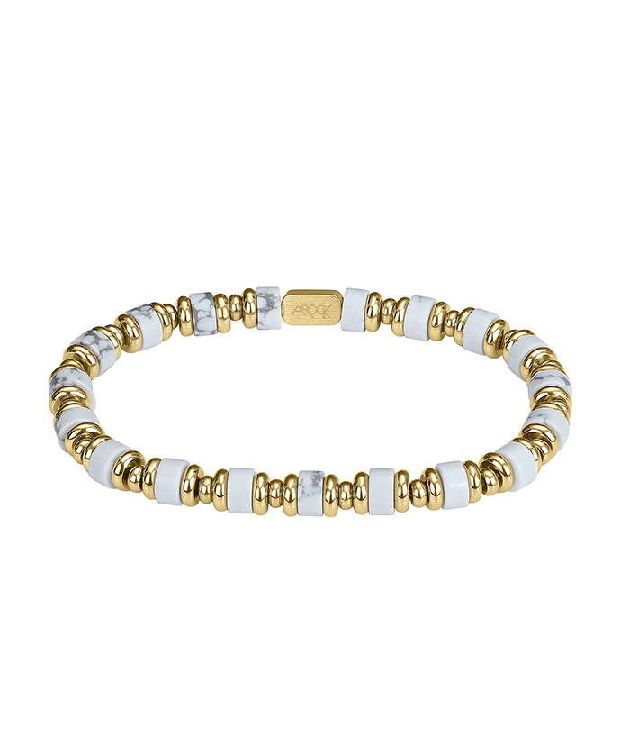 Kularmband av Vitmelerad Emperor och detaljer i blankt 14k Guldpläterat stål. Diameter på kula: 6 mm Längd: 19,5 mm, Elastiskt Färg: Guld/Vit Material: Rostfritt stål + Vitmelerad Emperor