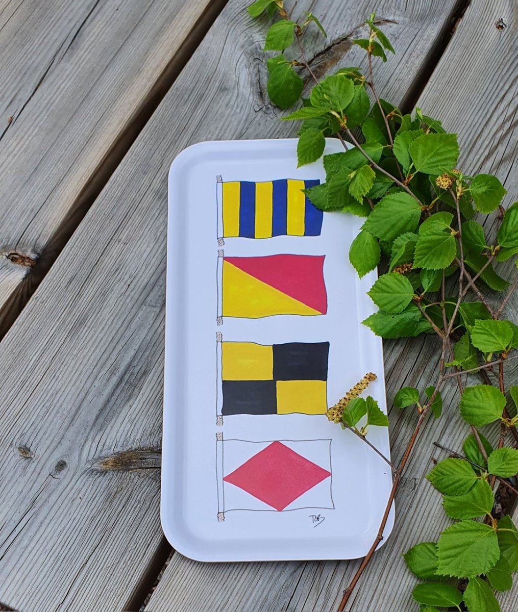Liten bricka med signalflaggor, med flaggor/bokstäverna G O L F, Sundboden Design. Vi målar motiv från Roslagen som sedan trycks på brickor av formpressat trä. Brickorna tillverkas i Sverige.