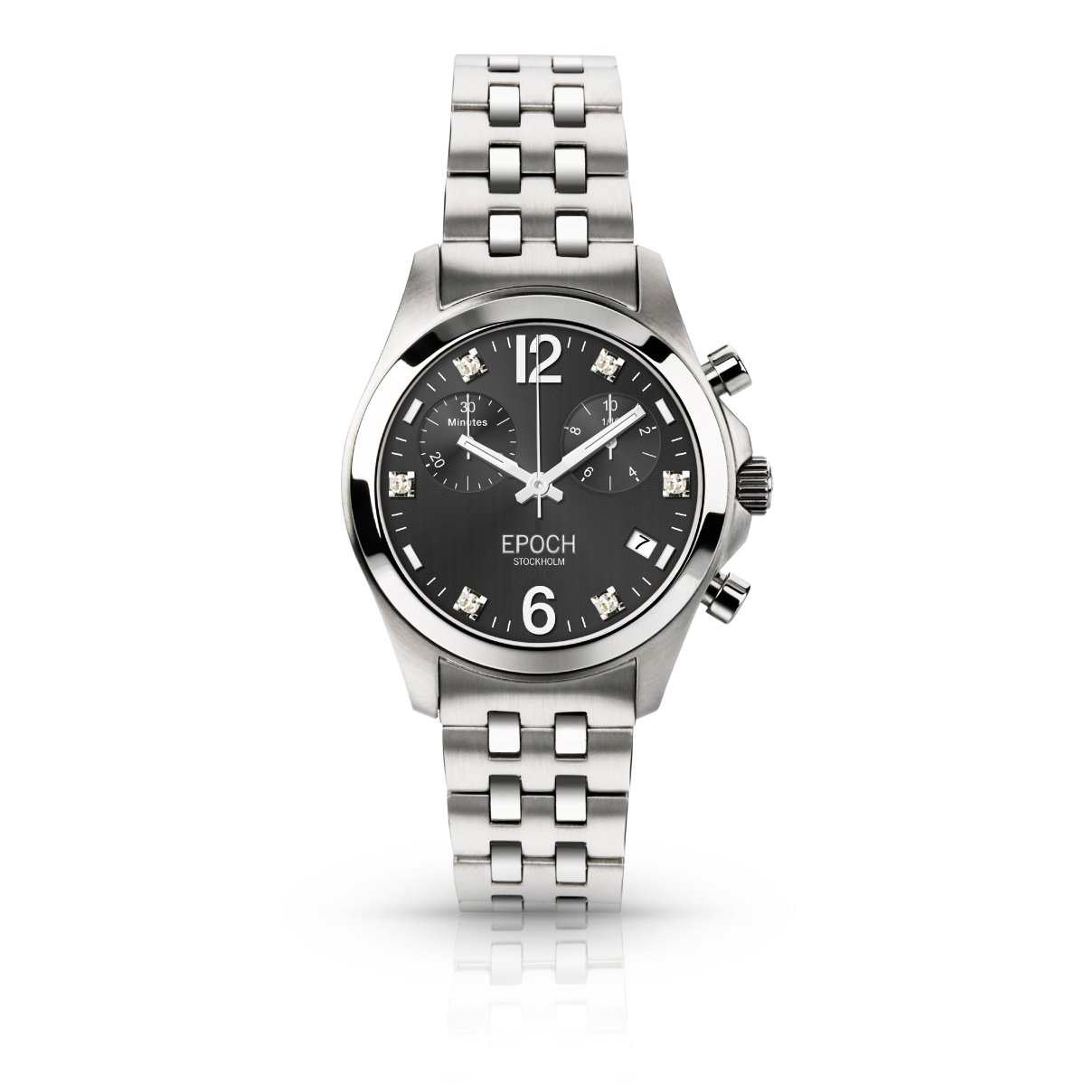 First Lady Chronograph är en modell som utstrålar sportig elegans. Urtavlan i grått är utsmyckad med 6 briljantslipade diamanter i Top Wesselton VS-kvalitet. Klockan har ett reptåligt safirglas, klarar ett vattentryck motsvande 100 meter och är utrustad med en Quartz-kronograf som mäter tider med en precision ned till 1/10 sekund. Epoch First Lady Chronograph levereras med en länk i rostfritt stål eller band i präglat kalvskinn.