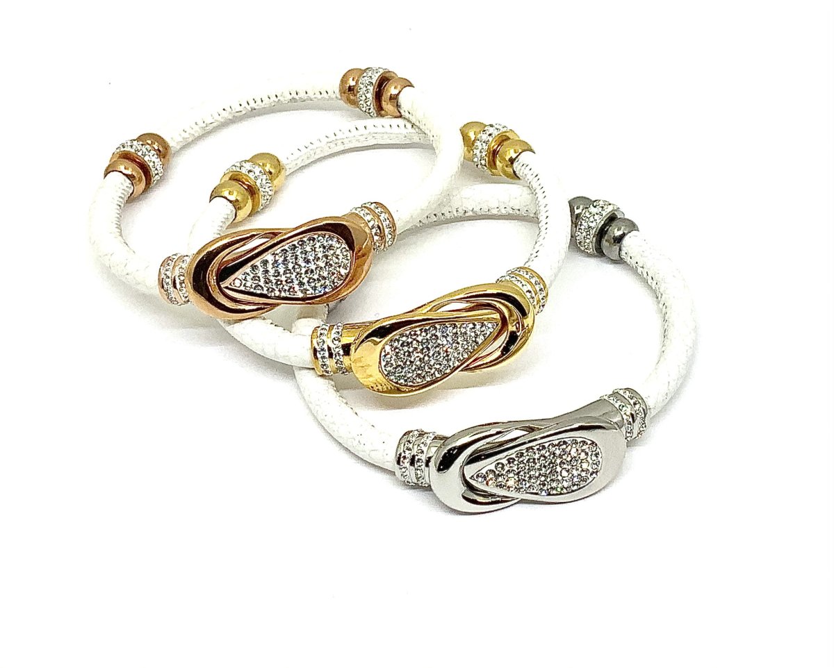 Snygga vita läderarmband med stenar i låset 20 cm lång Finns i rosè stål och guld på stål. Fräscht och fint armband med glitter på