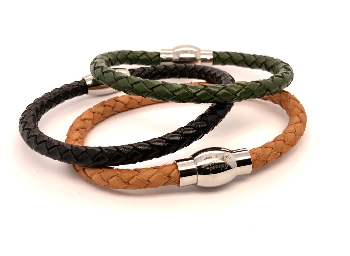 Läderarmband runt flätat med magnetnåls Finns i längder 17 cm,19cm, 20cm(svart) eller 21cm . Grönt, Ljusbrun