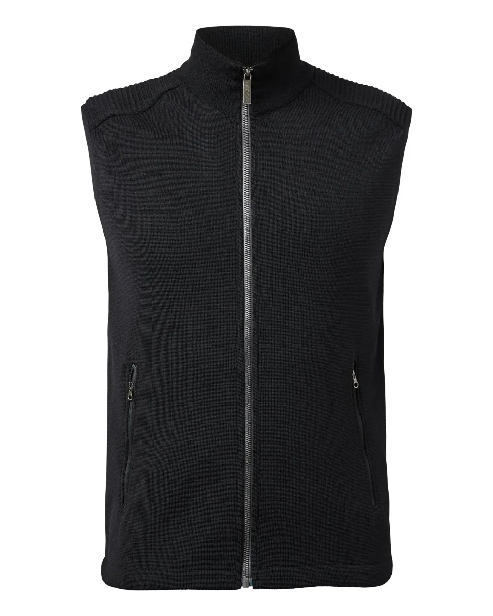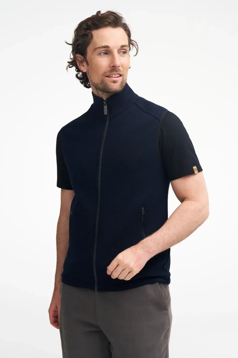 Ullväst i mjuk merinoull som med sina olika stickstrukturer får ett tufft och fräscht uttryck. Hel dragkedja framtill och dragkedja i sidfickorna. Västen har dragsko nertill som gör att man lätt kan justera passform och snitt.